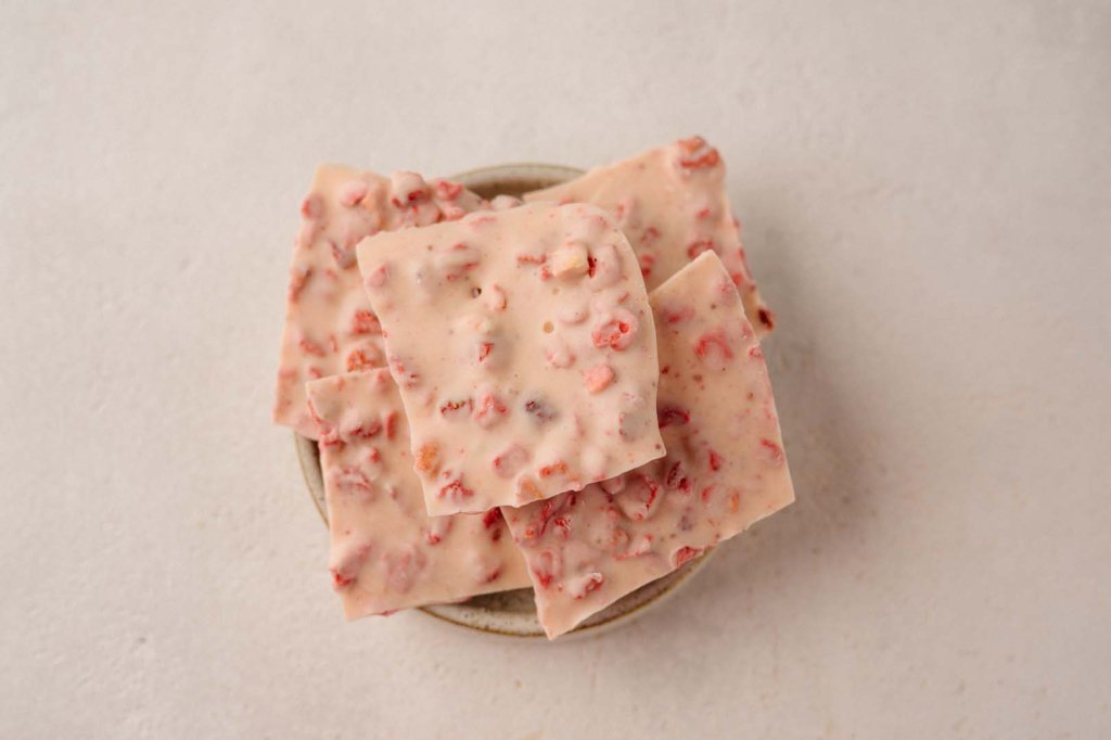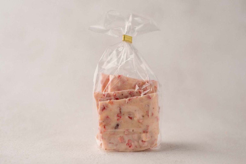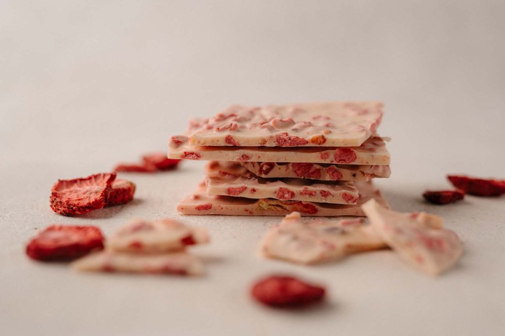 Eine cremige Schokolade, die den frischen, fruchtigen Geschmack von Erdbeeren mit der milden, erfrischenden Note von Joghurt vereint – ein köstlicher Genuss aus fruchtiger Süße und einer zarten, cremigen Textur.