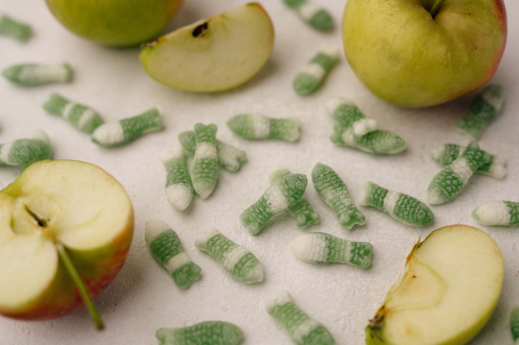 Grün-weiß gestreifte Apfelsprotte mit feinem Vanilleakzent.