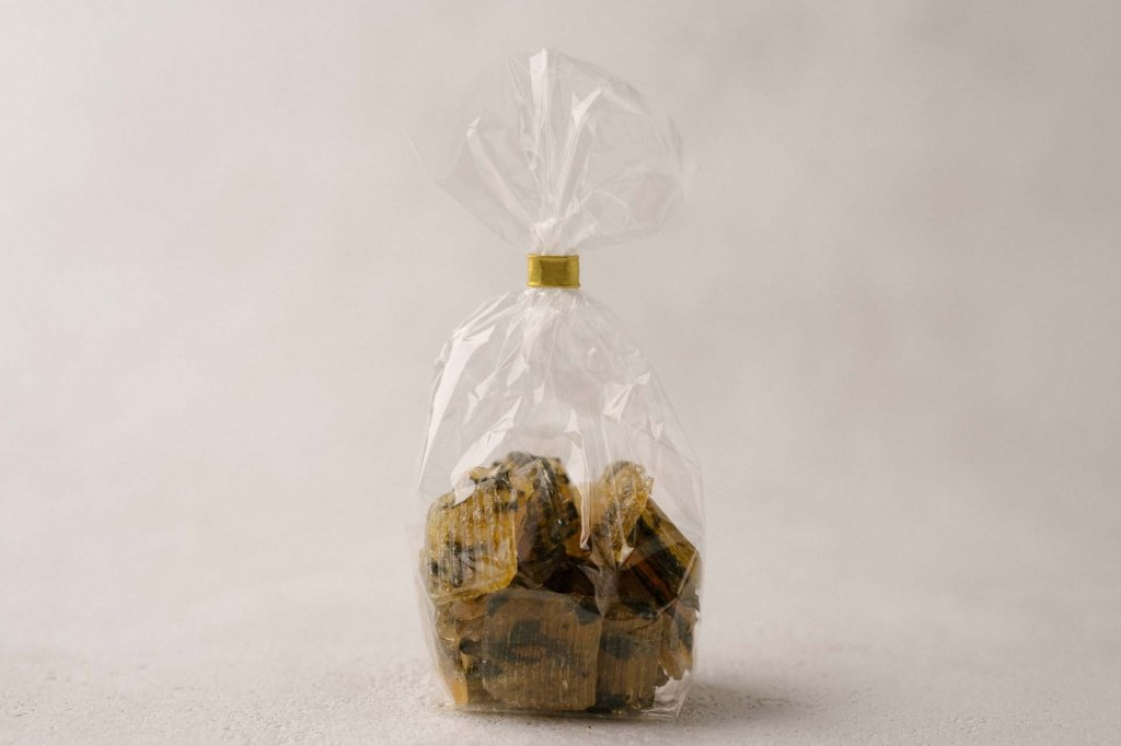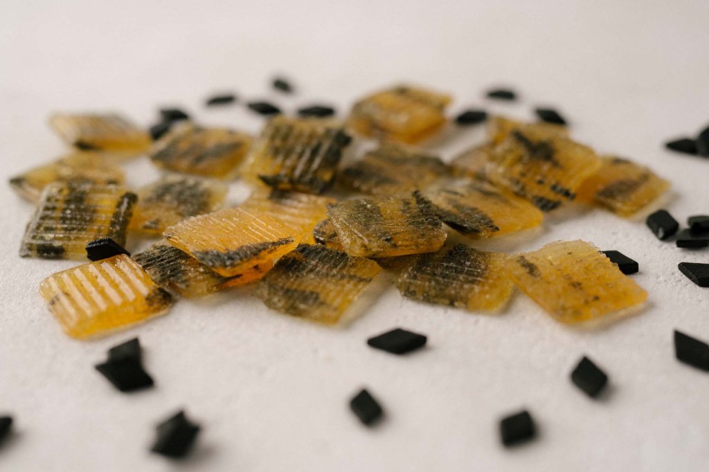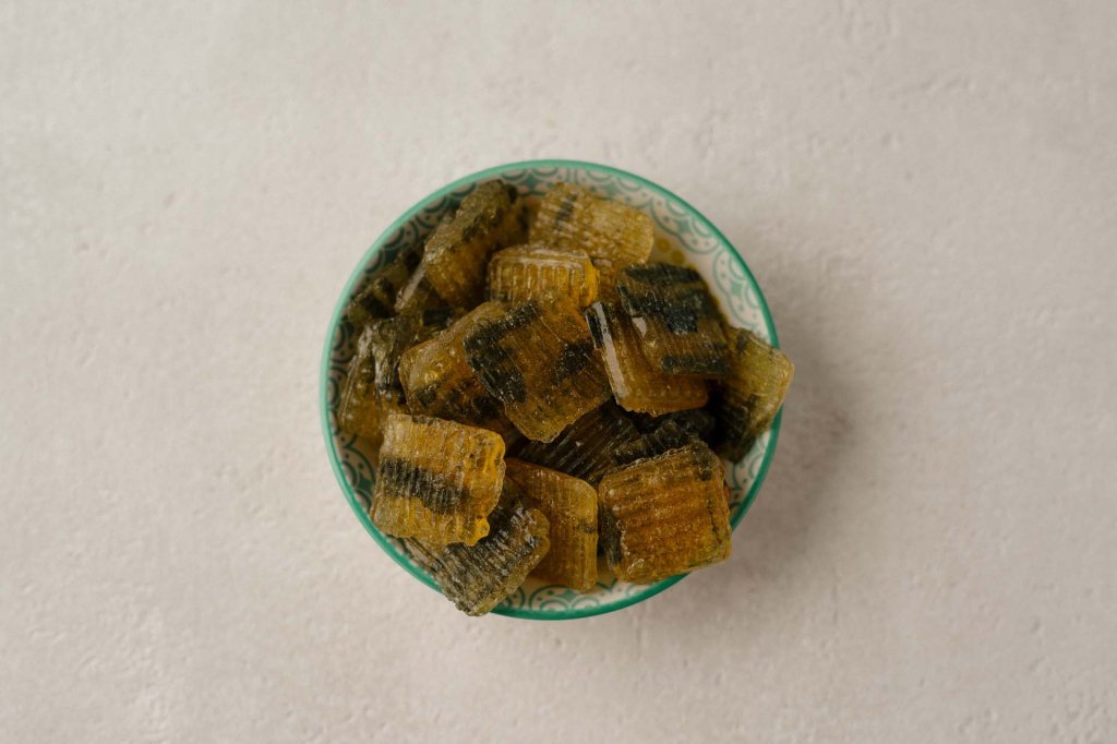 Flach geformtes Cachou-Bonbon – erinnert an einen klassischen Jahrmarkt-Lolly.