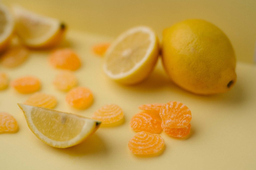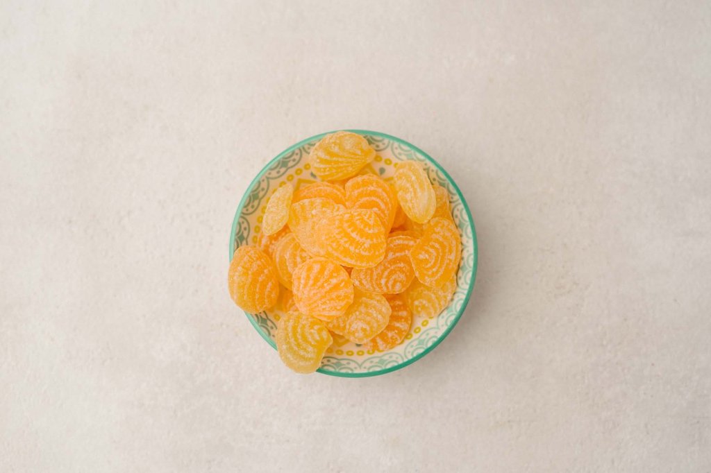 Zucker, Glukose, Weinsteinsäure, natürliches Aroma, Farbstoff: Beta Carotin E160.